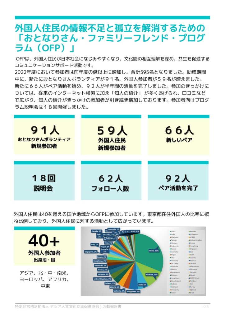 In the 2022 fiscal year, the number of participants more than doubled from the previous year, reaching a total of 595. During the grant period, we welcomed 91 new Otonari-san volunteers and 59 foreign participants. Additionally, 66 new pairs began activities, and 92 individuals completed six months of engagement. Regarding the reasons for participation, in addition to traditional internet searches, many cited "referrals from acquaintances," which have spread through word of mouth, leading to a continued increase in participants who joined through these referrals. We held 18 informational sessions for participants.