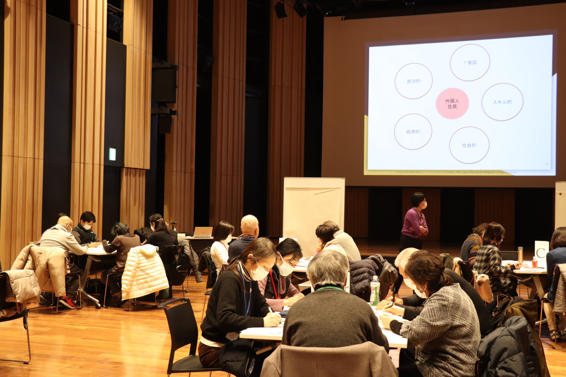 This training was held in the large hall of a beautiful local community center. Fuchu City currently has about 5,700 foreign residents, and the city is focused on supporting the integration of these foreign residents.