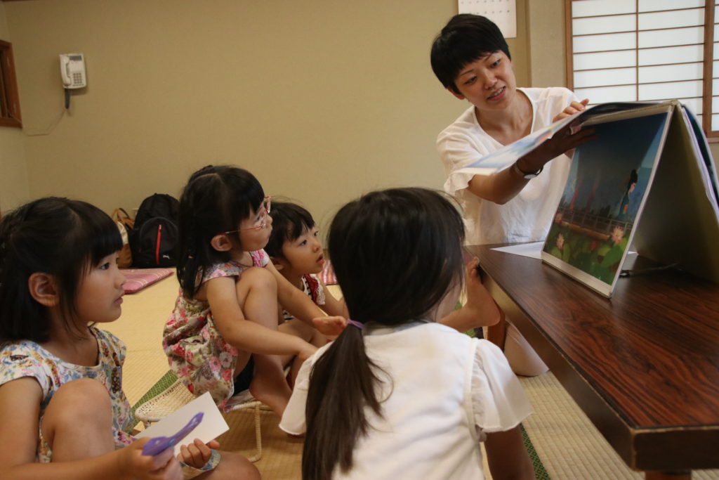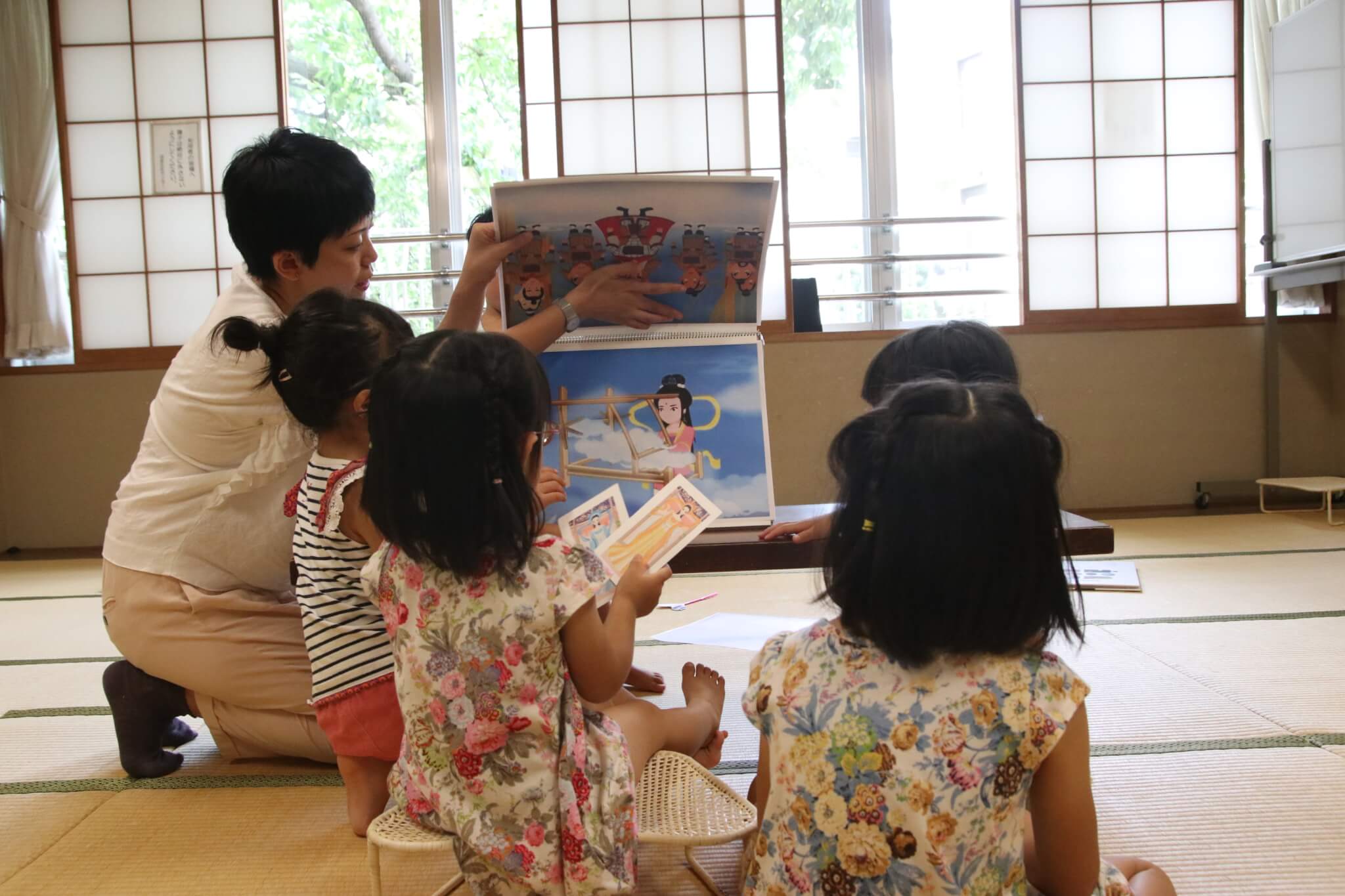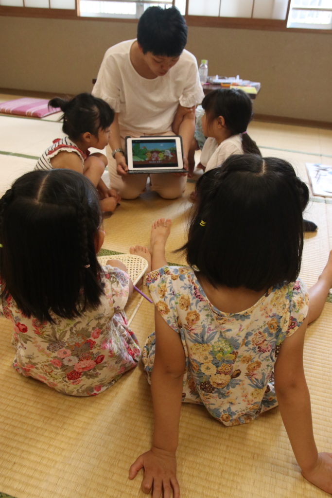 This time, for our Tanabata project, we created a paper play based on the Chinese version of the story of Orihime and Hikoboshi. We distributed a summary in Japanese for the parents. In Japan, the Tanabata story seems to convey the message that one should not be lazy, while in China, it tells the tale of true love that moved the hearts of the gods. (If you're interested, please see the notes at the end.)