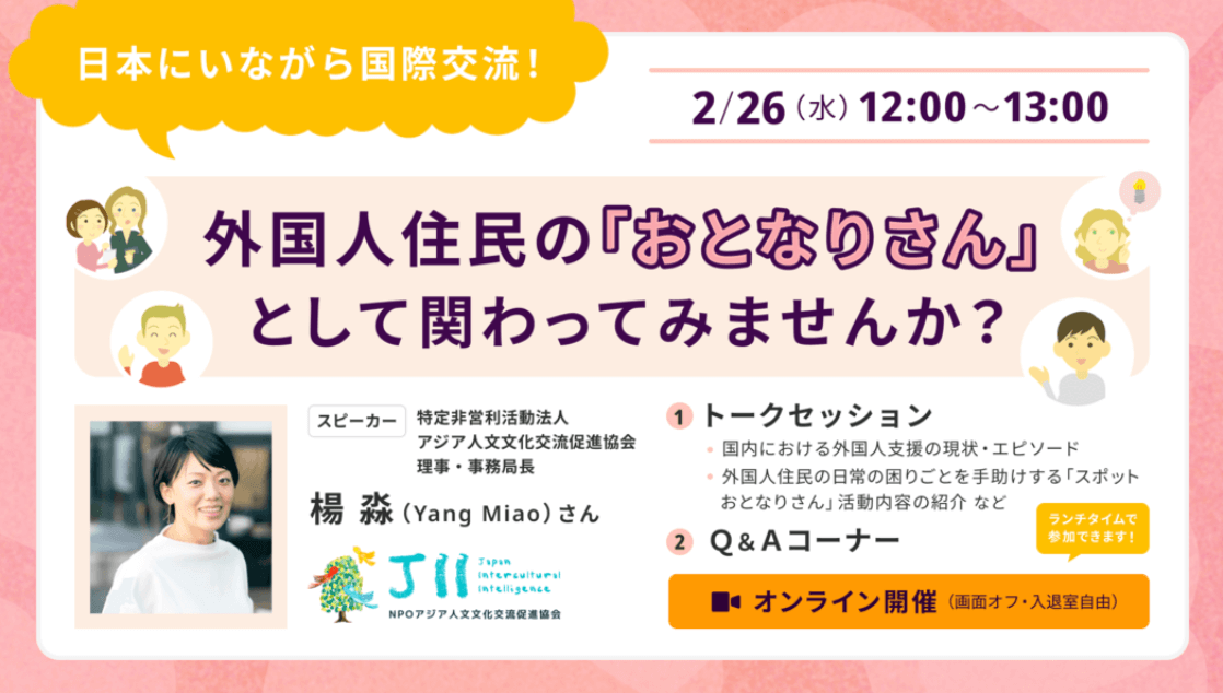 The new initiative "Spot Otonari-san" provides essential support for foreigners living in Japan, addressing challenges in key areas of daily life such as welfare, education, healthcare, and basic infrastructure. This program offers volunteer-based, one-time assistance, primarily focusing on procedural support and language assistance.