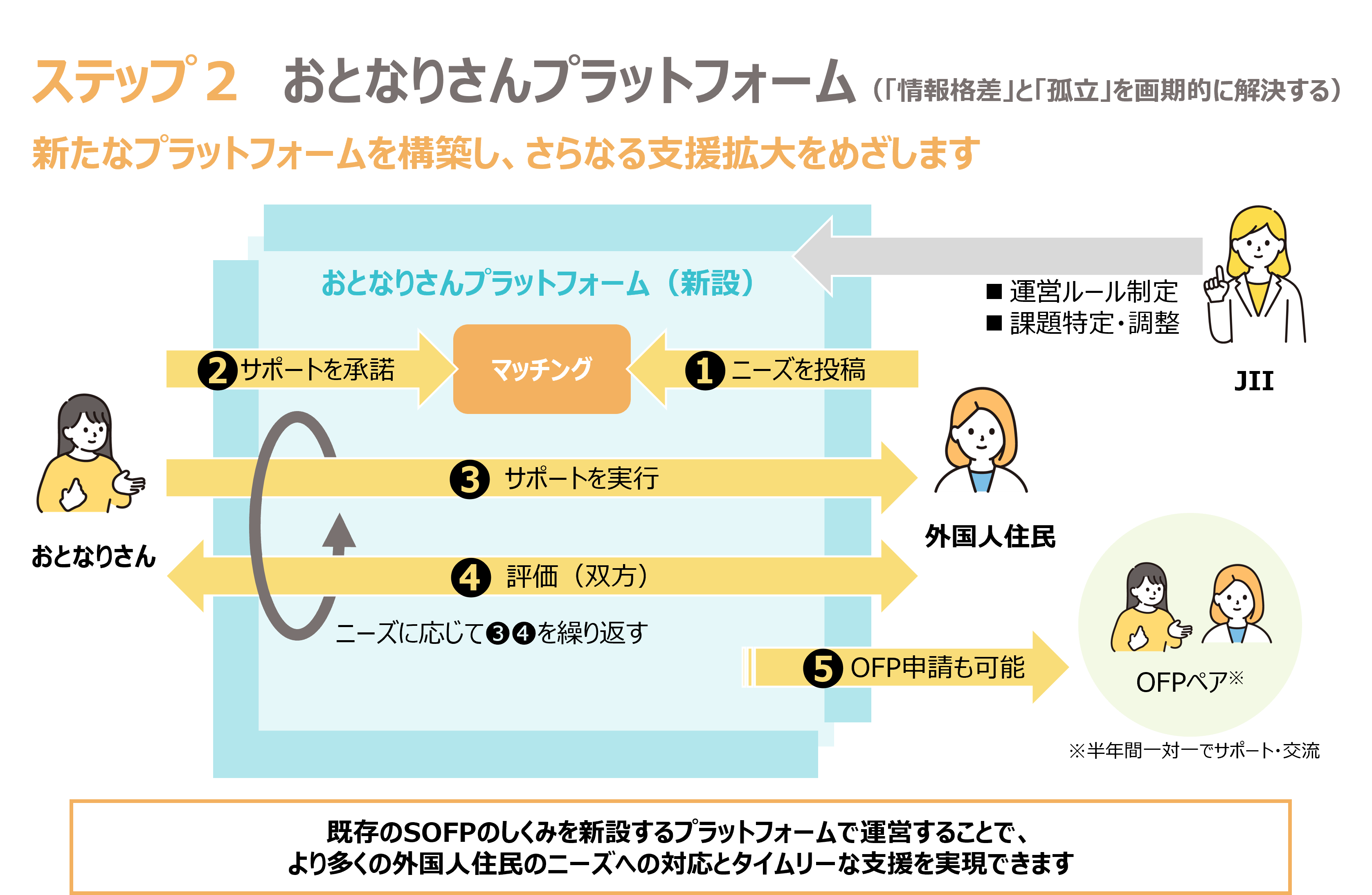 यस ठूलो खाली ठाउँको लागि, JII(जेआइआइ) ले चार वर्षअघि जापानमा पहिलो पटक "ओतोनारी-सान् फामिली फ्रेन्ड प्रोग्राम (OFP)" सुरु गर्यो। यो जापानको पहिलो प्रयासको रूपमा, जापानी बासिन्दाहरूको नेतृत्वमा, विदेशी बासिन्दाहरूको जीवनयापनको कठिनाइ र एक्लोपनलाई हटाउने, समुदायमा स्वागत गर्ने, र एकअर्कासँग मिलेर बस्न सक्ने समाजको लक्ष्य राख्ने गतिविधि हो। OFP मार्फत मानिसहरूलाई जोड्दै, सँगै बस्ने समाजको सदस्यको रूपमा एकअर्कालाई स्वीकार गर्दै अघि बढ्छौं।