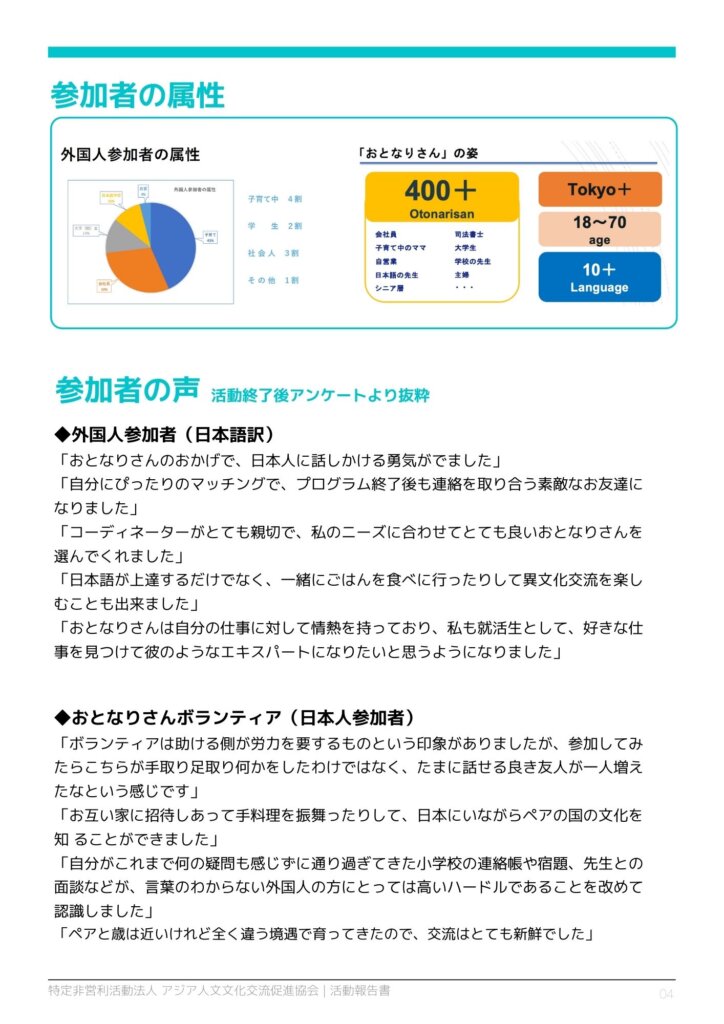 "विदेशी सहभागीहरूलाई स्थानीय जापानी स्वयंसेवकहरूसँग साझेदारी गर्ने क्रियामा, मैले कार्यक्रम समाप्त भएपछि पनि सम्पर्कमा रहने राम्रो साथीहरू बनाएको छु।"