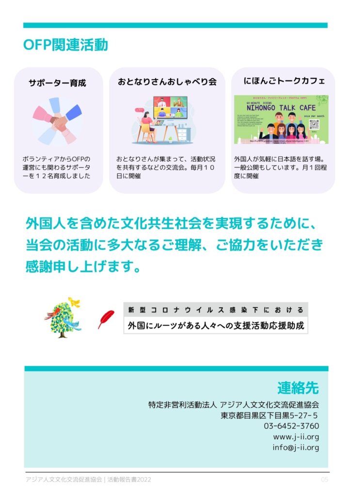 OFP भनेको विदेशी बासिन्दाहरूलाई जापानी समाजमा सजिलै घुलमिल गर्न, सांस्कृतिक समन्वयको आपसी समझदारीलाई गहिरो बनाउन र सहअस्तित्वलाई प्रोत्साहन गर्न सहयोग गर्ने सञ्चार समर्थन गतिविधि हो।