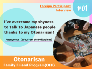 I think because of the OFP, I feel more confident that I can always ask someone for help if I have some problems. I actually feel more safe and confident about my daily life. Even though I now have a Japanese husband, I don’t want to always bother him with my problems. If I talk about my problems about my daily life to my husband all the time, we just talk about problems. When I talk to my husband, I would like to focus on other things like what we want to enjoy together, so it’s really nice to have another person who can help you. My Otonarisan became someone who I think of talking to when I want to consult with someone.