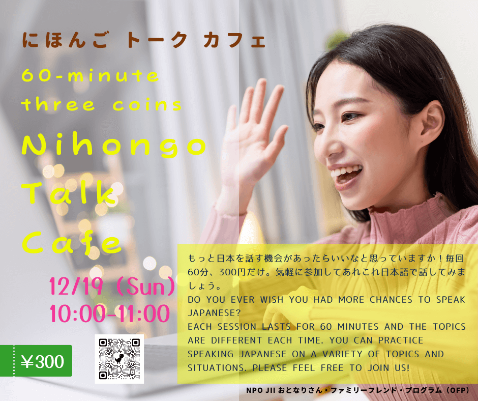 आउनुहोस्, OFP मा धेरै प्रकारका ओतोनारी-सानसँग कुराकानी गरौं! प्रत्येक सत्र ६० मिनेटको हुन्छ र हरेक पटक विषयवस्तु फरक हुन्छ। तपाईंले विभिन्न विषय र परिस्थितिमा जापानी बोल्न अभ्यास गर्न सक्नुहुन्छ। कृपया हामीसँग सामेल हुन नहिचकिचाउनुहोस्!